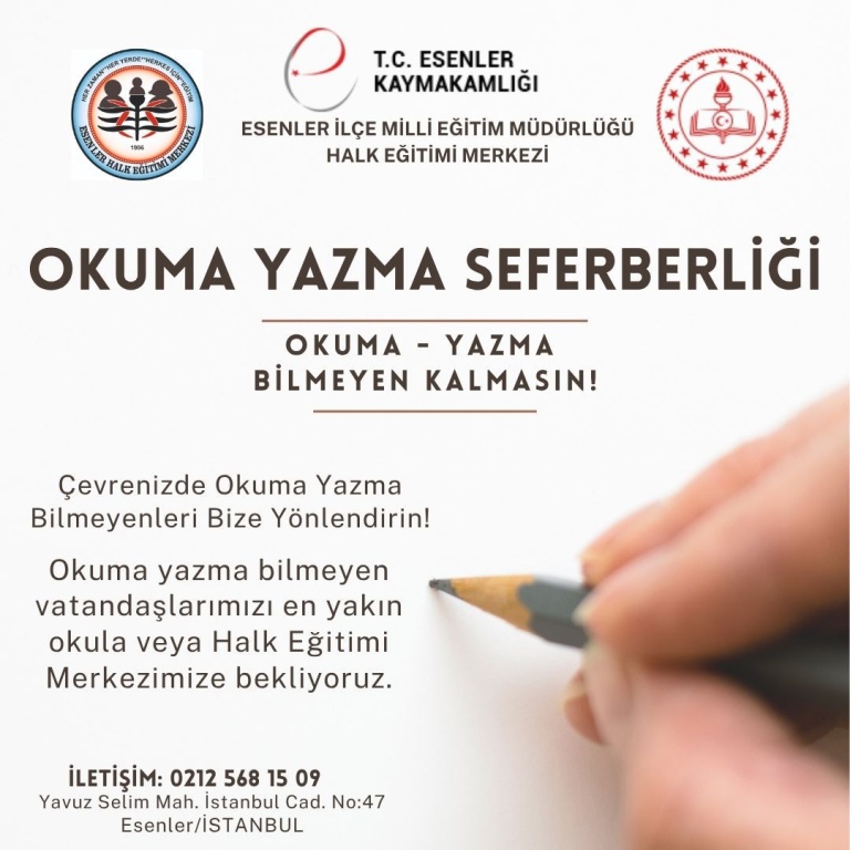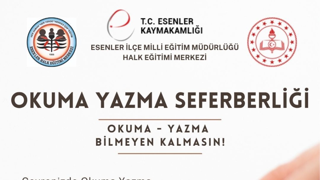 Esenler Kaymakamlığı tarafından başlatılan "Okuma Yazma Seferberliği", okuma yazma bilmeyen vatandaşlarımız için oldukça güzel bir fırsat. Sizlerin de çevrenizde okuma yazma bilmeyen ve öğrenmek isteyen tandıklarınız, eş-dost-akrabalarınız varsa onları en yakın okullara ya da Halk Eğitim Merkezine bekliyoruz. Unutmayın okumanın ve öğrenmenin yaşı yoktur...